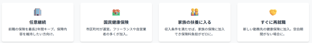 主な選択肢として「任意継続」や「国民健康保険」が挙げられますが、他にも「家族の扶養に入る」といった方法も考えられます。