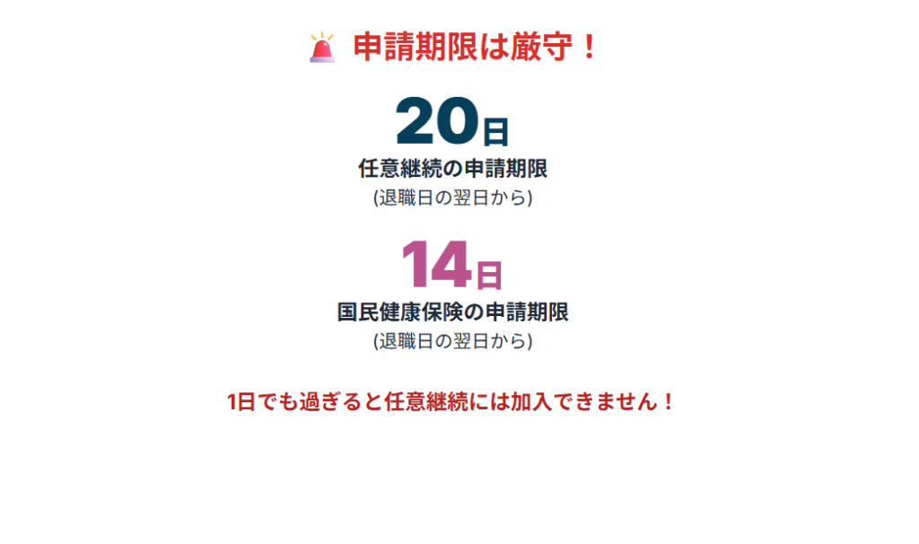 退職後の健康保険手続きにおいて、最も注意しなければならないのが申請期限です。