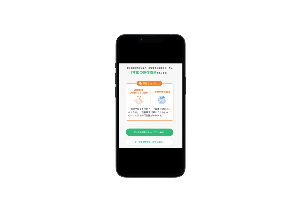 ただし、画面にも表示されている通り、確定申告に関するデータは7年間の保存義務があるため、データを事前に保存しておくなどの対策をしないと、後に青色申告の取り消しなどのペナルティの可能性がある点には注意が必要です。