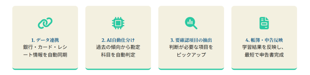 具体的には、銀行の明細やクレジットカードの利用履歴を取り込み、過去のデータや他ユーザーのデータを学習したAIが勘定科目の判定を自動で行います。